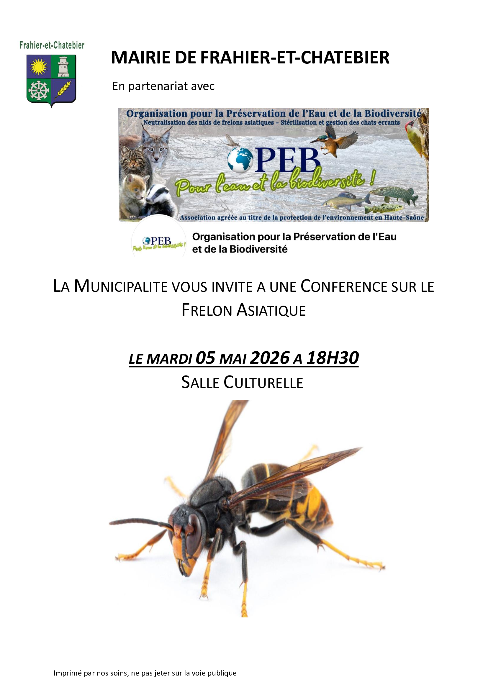 La commune de Frahier-et-Chatebier, en partenariat avec l'OPEB, organise une conférence sur le frelon asiatique. Mardi 5 mai à 18h30 à la Salle Culturelle.