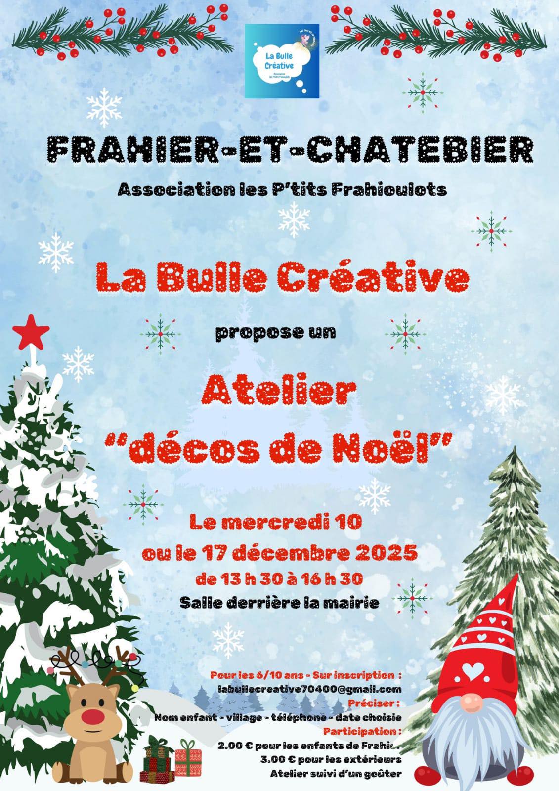 Atelier spécial déco de Noël avec la Bulle Créative, les mercredis 10 et 17 décembre de 13h30 à 16h30, dans la salle derrière la mairie de Frahier-et-Chatebier. Atelier suivi d'un goûter.