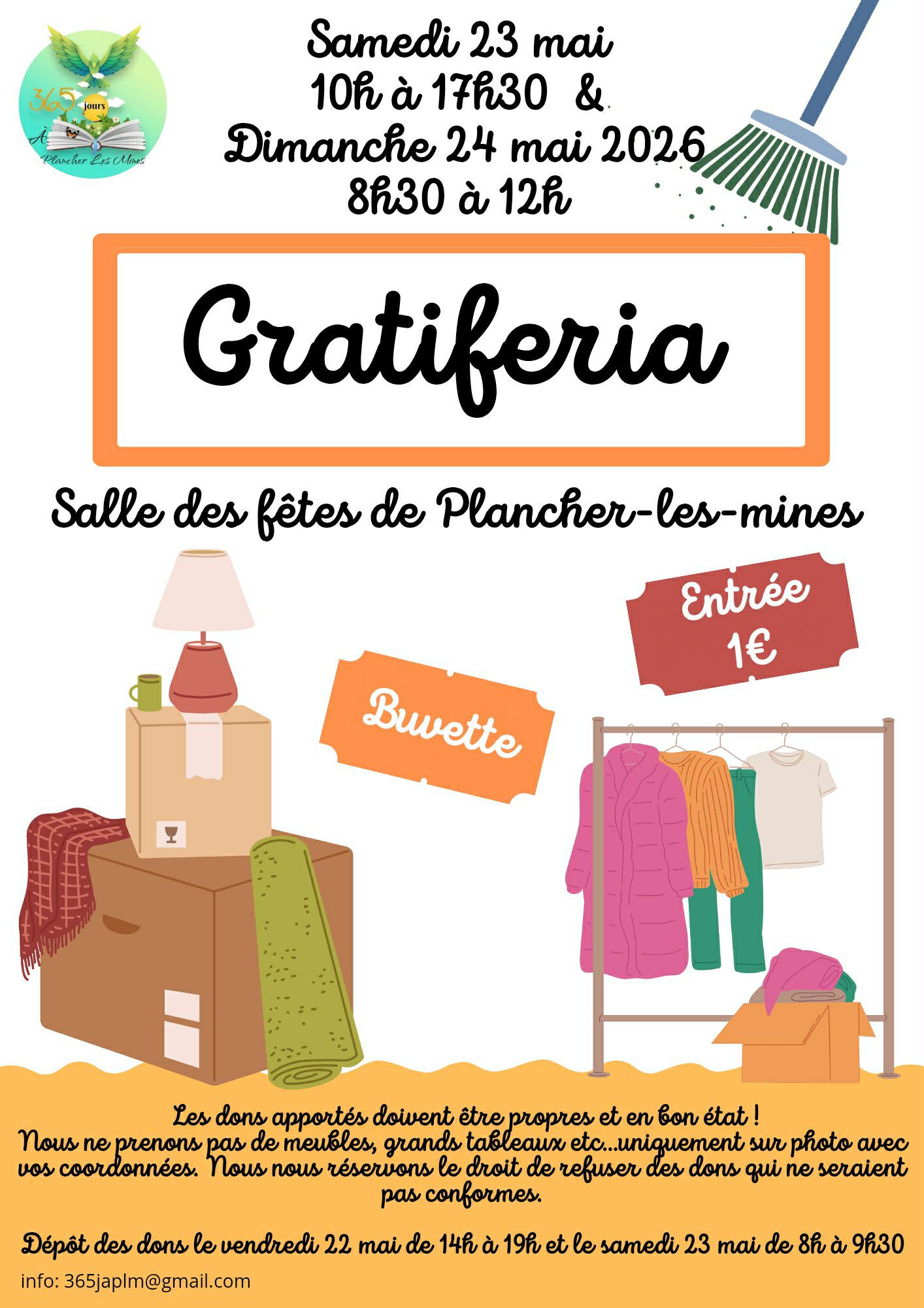 Dépôt des dons le 22 mai de 14h à 19h et le 23 mai de 8h à 9h30 . Ouverture au public le samedi de 10h à 17h30 et le dimanche de 8h30 à 12h.
