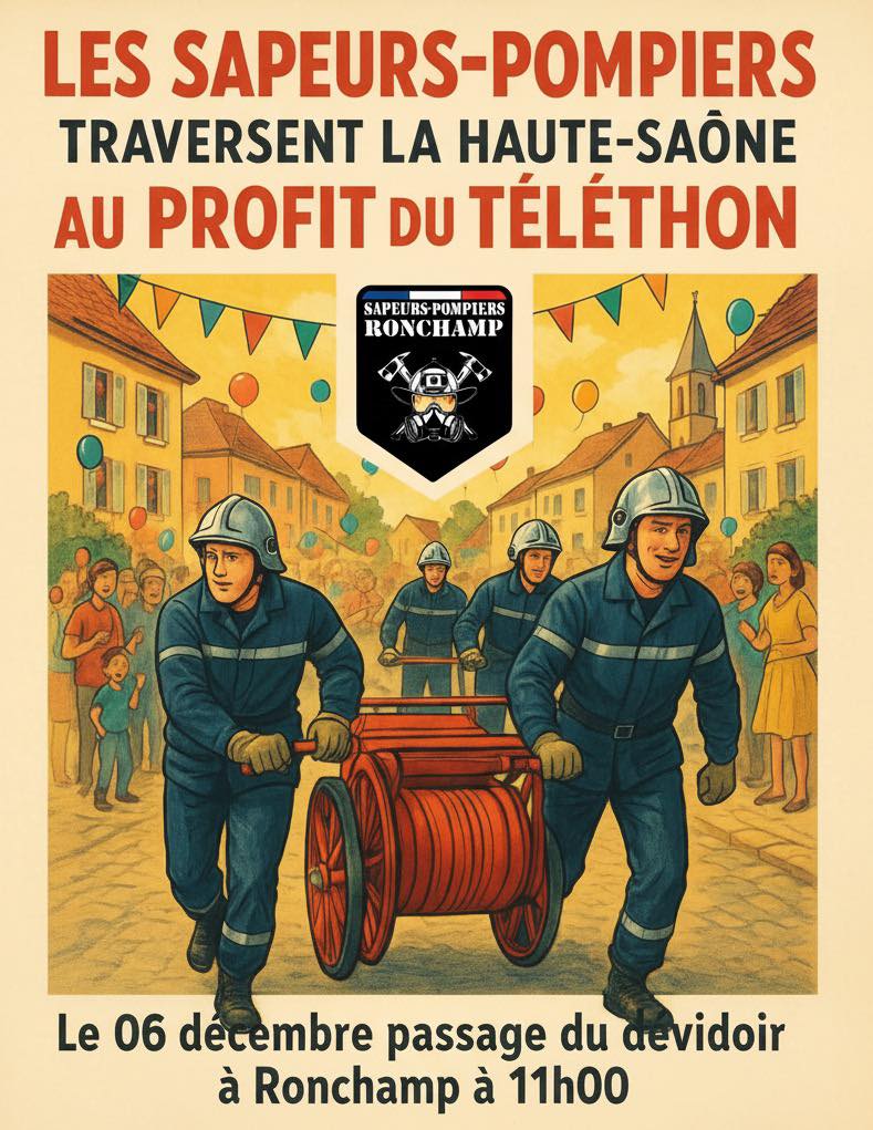 Les Sapeurs Pompiers de Ronchamp traversent la Haute-Saône au profit du téléthon. Passage du devidoir à Ronchamp samedi 6 décembre à 11h.